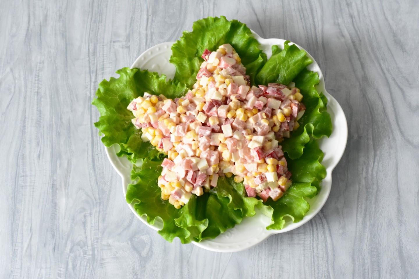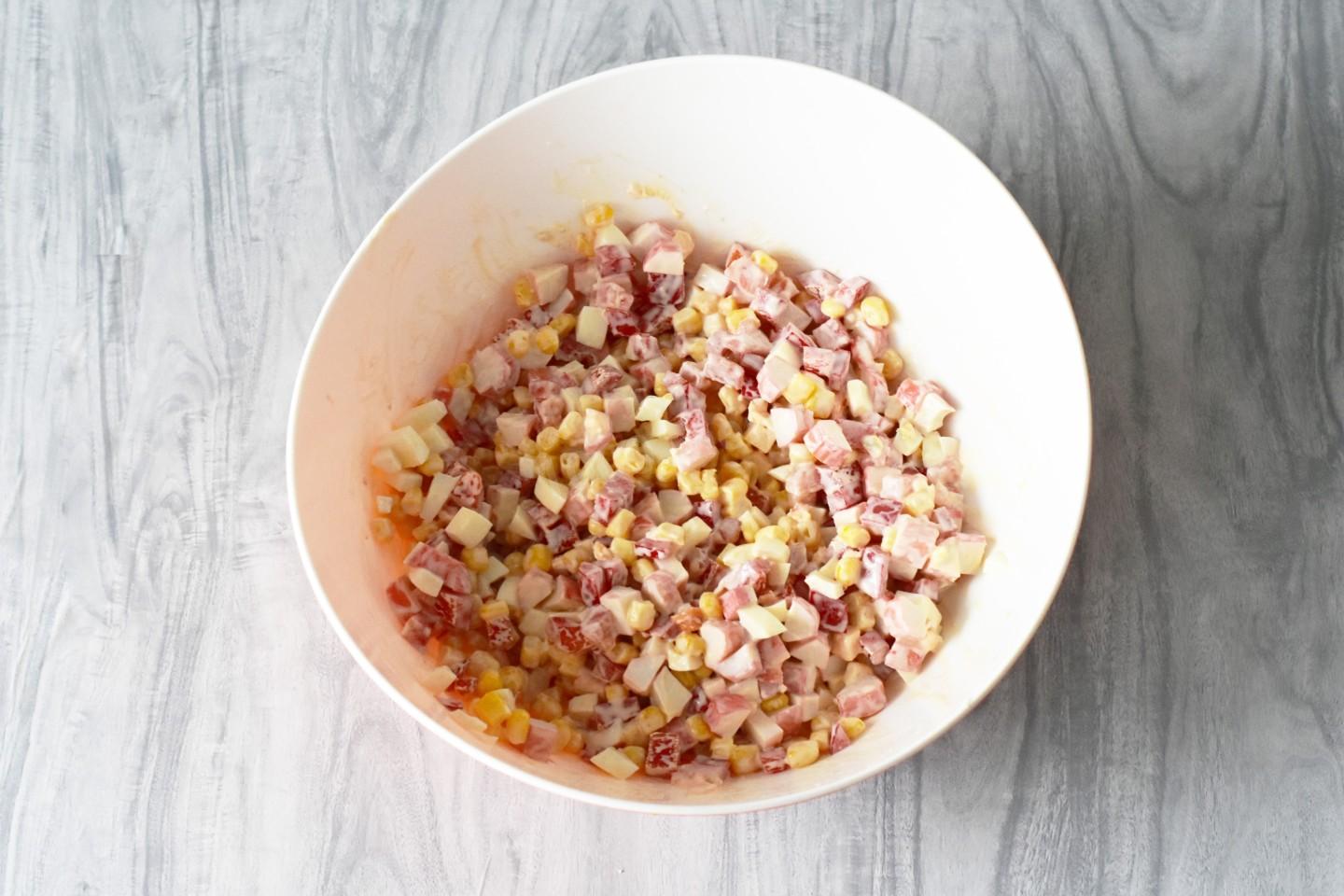 В миске соедините красную рыбу, крабовые палочки, консервированную кукурузу, яйца и болгарский перец. Заправьте салат майонезом и перемешайте. Майонез можно сделать самостоятельно. Рецепты домашнего майонеза вы найдёте после последнего шага.