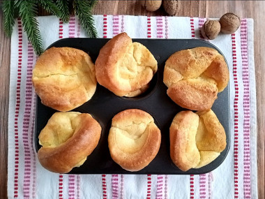 Поставьте форму в духовку и выпекайте при 230℃ около 15 минут. Затем снизьте температуру до 180℃ и выпекайте еще 10-15 минут. Под форму положите пергамент, чтобы не забрызгать духовку жиром. Узнать об особенностях работы духовок, а также об особенностях различных видов пергамента можно, прочитав отдельную статью, ссылка в конце рецепта. Готовые блинные домашние красивые булочки выньте из формочек.