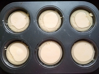 Поставьте форму для маффинов в разогретую до 230℃ духовку на 5 минут. Затем форму выньте и в каждую ячейку влейте по 1 ч. л. растительного масла. Следом вылейте тесто, немного не доходя до краев формочек. Такого количества теста мне хватило на 12 формочек диаметром 6 см.