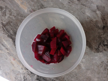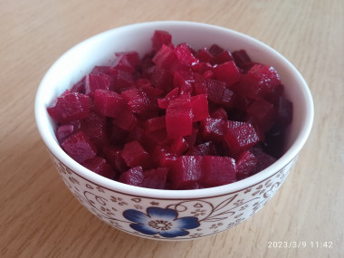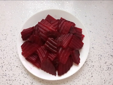 Свеклу предварительно отварите в кожуре в кипящей воде до готовности или заверните в фольгу и запеките в разогретой до 180°С духовке в течение 1 часа. Точное время зависит от свежести и размера овощей. Готовую свеклу охладите, очистите от кожуры и нарежьте дольками или кружочками.