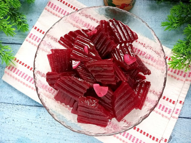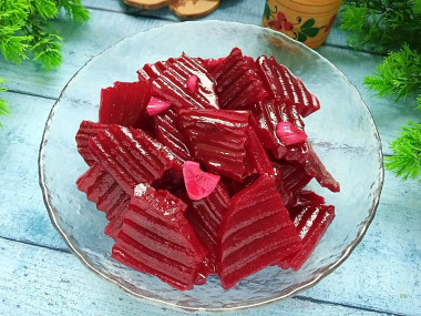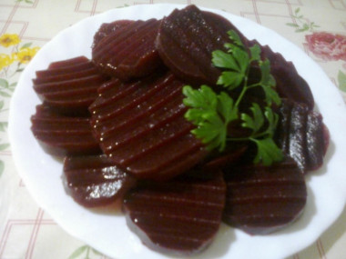 Можно по этому рецепту сделать заготовку. Для этого нужно сложить свеклу в предварительно простерилизованные банки, залить горячим маринадом и закатать.