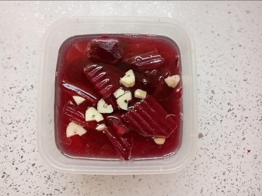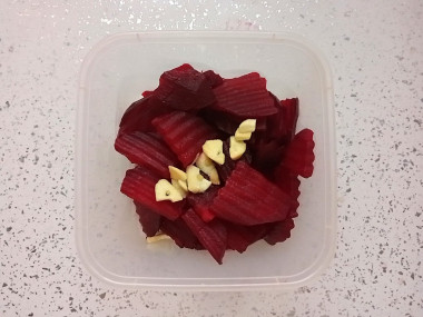 Свеклу для этой закуски я запекала, т. к. она была очень крупная. К тому же при таком способе свекла сохраняет больше вкуса и витаминов как мне кажется. После охлаждения нарезала ее фигурным ножом на четвертинки. Чеснок нарезала пластинками. Все сложила в контейнер и залила горячим маринадом. Примерно на 5 часов оставила на столе, а потом на ночь убрала в холодильник.