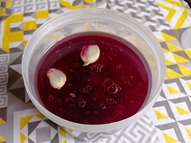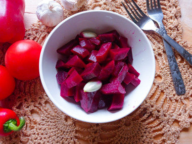В глубокую миску выложите вареную свеклу и измельченный чеснок. Залейте все маринадом.