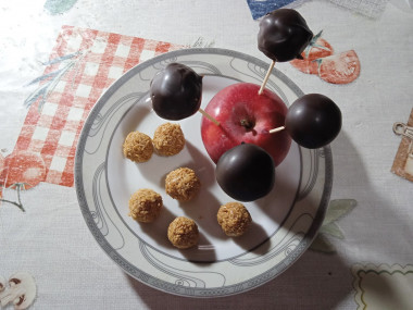 Взяла за основу этот рецепт, как идею вкусных конфет. Только заменила ингредиенты и орехи не использовала, так как их не ест ребенок. Ещё решила готовые конфеты обмакнуть в растопленный шоколад. Готовил конфеты мой сынок практически самостоятельно. Ему очень понравилось такое занятие. Сам сделал и сам съел) А кокосовую стружку использовали собственного приготовления из свежего кокоса, в этом муж помогал. Очень быстро сделали домашние конфетки. Смешали варёную сгущёнку с кокосовой стружкой. Налепили шарики и убрали ненадолго в морозилку. Накололи кокосовые шарики на зубочистки. Затем обмакнули с шоколад, воткнули в яблоки и немного подождали, чтоб застыли. Потрясающе вкусные и красивые получились конфеты Рафаэлло. Они внутри мягкие, сладкие, а снаружи в шоколаде. Большое спасибо автору за идею. Благодаря этому рецепту, мне пришла в голову оригинальная идея)