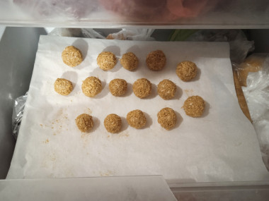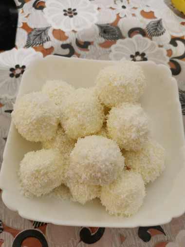 Слегка смоченными в холодной воде руками формируем конфеты в форме лепешек, на каждую лепешку вкладываем орешек и сворачиваем лепешки в виде шариков нужного вам размера - у меня средние, Готовые конфеты обильно обваливаем в кокосовой стружке со всех сторон.