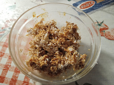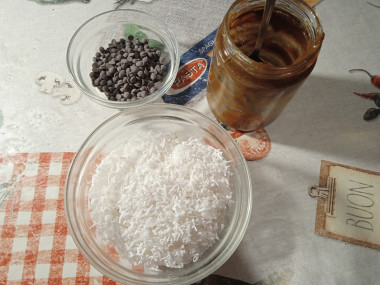 100 граммов кокосовой стружки смешиваем с сахарной пудрой и с помощью кофемолки или блендера смалываем смесь практически в муку (чем мельче получится крошка, тем нежнее получатся конфеты).
