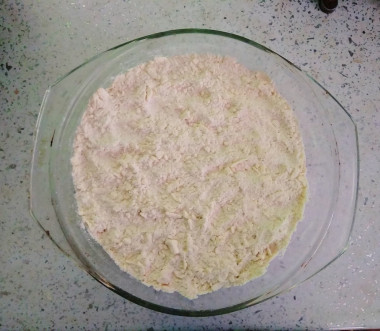 Осталось приготовить тесто - песочную крошку. В миску насыпьте муку и сахар. Достаньте из морозилки масло, положите его в муку.