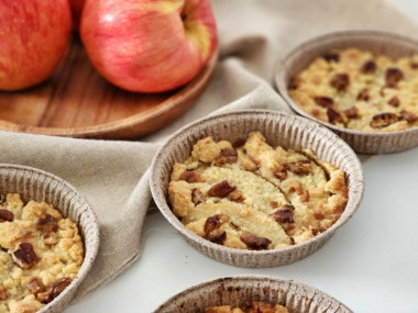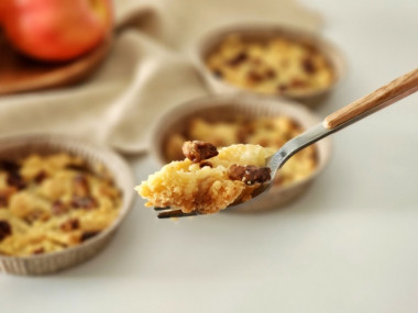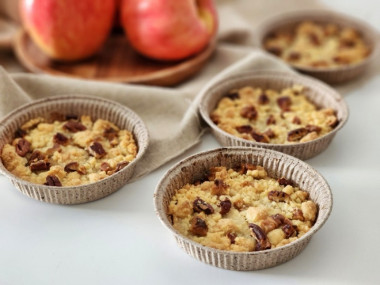Для выпечки я использовала одноразовые формочки диаметром 9 см и высотой 2 см. Получилось четыре порции. Поскольку формочки у меня маленькие, поэтому ингредиентов понадобилось меньше. На песочную крошку у меня ушло 60 г муки, 30 г сахара и 30 г масла. Песочную крошку делала строго по рецепту, а вот в начинку внесла немного изменений. Я решила не готовить яблоки на плите, а использовать их свежими, чтобы и время сэкономить, и витамины сохранить, тем более, что яблоки у меня были сладкими. Мне понадобилось одно большое яблоко. Коричневого сахара у меня было совсем немного, примерно 7 г, поэтому я еще добавила в начинку кленовый сироп 20 г. И конечного немного корицы. Все ингредиенты для начинки хорошо перемешала и выложила в формы для выпечки. Поверх песочной корочки я также положила нарезанные грецкие орехи. Выпекала согласно рецепту. Крамбл хорошо подрумянился и был готов.