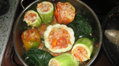Практически я взяла идею голубцов, но готовила фаршированные овощи: перец, кабачок, патиссон и листья мангольда.