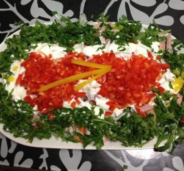 Выкладывала салат слоями, смазывая их майонезом. Самый верхний слой с помидорами получился очень нарядным и аппетитным.
