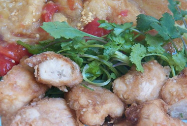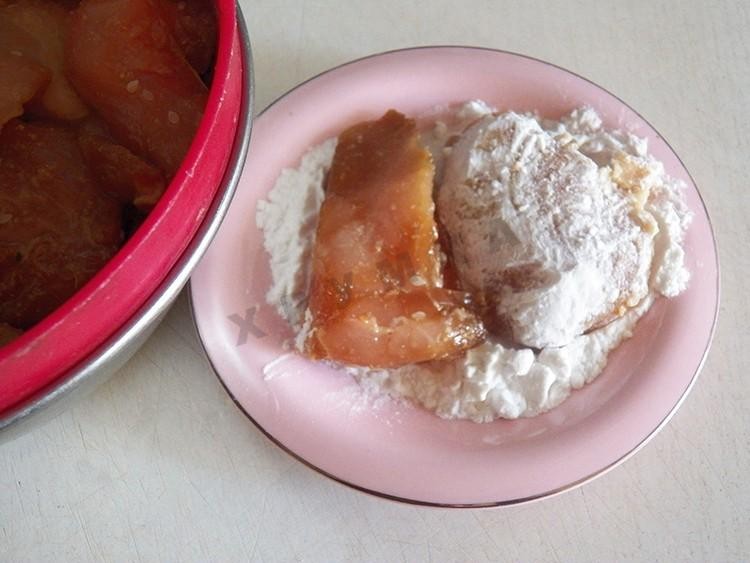 Свежего имбиря у меня не было, но у меня был молотый имбирь, которым я и воспользовалась. В мариновании я использовала текилу, кунжутное масло собственного приготовления, то есть я его немного приготовила еще в прошлом году, добавив в не пахучее подсолнечное масло горстку кунжута, оставила его в холодильнике. Мясо хорошо пропиталось вкусом кунжута. А все остальное делала согласно рецепту. Панировала в крахмале.