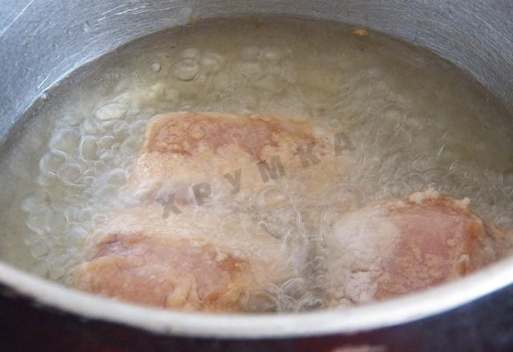 и фритируйте их в кипящем масле, время от времени переворачивая, пока куски не приобретут золотисто-коричневую корочку