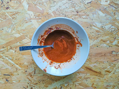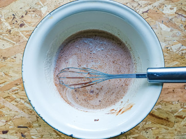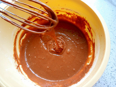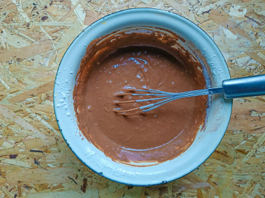 Частями всыпьте в тесто просеянную муку с какао, разрыхлителем и солью, каждый раз перемешивая венчиком до однородности. Не торопитесь добавлять в тесто сразу всю муку. Ее может понадобиться больше или меньше. Многое зависит от размера яйца и качества самой муки.