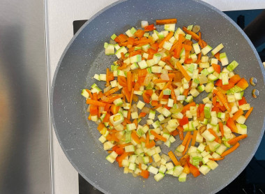 Кабачок цукини вымойте и нарежьте средним кубиком, добавьте в сковороду к остальным овощам и перемешайте.
