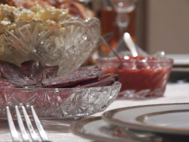 У меня есть один снимок новогоднего стола, на котором не очень хорошо, но виден суджук и бастурма. Ну, а если получится, Анка, покажите приготовление суджука.
