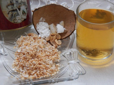 А десерт я придумала такой: благодаря Ирише в наш дом "вошел"кокосовый орех, сок его мне понравился, но вот мякоть подсушила в духовке, протерла на терке вместе с арахисом и добавила сахарную пудру, перемешала и получилась прекрасная постная вкусняшка. А чай заварила опять зеленый, но другой: сыну подарили чай"Чаи Крыма",состоящий из нескольких трав(одна чувствуется - мята) которых у нас нет в продаже. Ну вот им и балуюсь