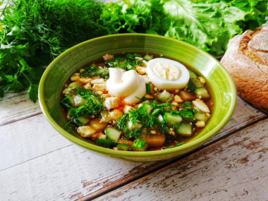 При подаче к столу на тарелку сначала надо выложить подготовленную смесь, а потом залить заправленным квасом. При желании вы можете посыпать готовую еду укропом или добавить сметаны.