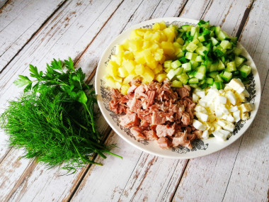Сначала отварите в подсоленной воде картофель. Остудите его, очистите от шкурки и нарежьте небольшими кубиками так, как будто будете готовить оливье. Возьмите свежие огурчики и белки сваренных вкрутую яиц и порежьте кубиками такого же размера. Яичные желтки нужно растереть с горчицей, сметаной, сахаром и солью, а затем залить квасом. Хорошо размешайте желтки и дайте смеси постоять пару минут.