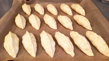 Выложите пирожки на противень, выстеленный бумагой для выпечки.