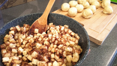 Отправьте сковороду на плиту на маленький огонь. Потомите яблоки, помешивая их лопаткой, около 5 минут. У меня попался сухой сорт, яблоки почти не выделили сока, но на вкусе начинки это никак не сказалось. Можете добавить в начинку немного сливочного масла, положите его в самом начале вместе с яблоками.