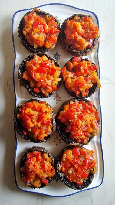 Подготовленные шляпки нафаршируйте овощной начинкой с ножками грибов. Переложите их аккуратно на противень. И выпекайте в разогретой до 190-200 С духовке около 10-15 минут. Точное время и температуру определяйте по своей духовке. Об особенностях разных духовок читайте в статье в конце этого рецепта.