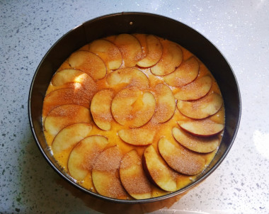 Выложите яблоки поверх теста. При желании можете часть яблок нарезать небольшими кубиками и вмешать в тесто, а оставшиеся разложить дольками поверх теста.
