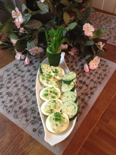 Вчера готовила фаршированные яйца - очень вкусно, у меня осталось немного начинки и я решила приспособить ее и ничего другого не придумала, как начинила ею свежий огурец))) Получилось очень красиво, но и вкусно, я его подержала пару минут в морозилке, а потом нарезала кружочками - сейчас покажу эффект от этой идеи, теперь хочу еще раз повторить тоже самое, только внутреннюю мякоть от огурца порезать и тоже добавить в начинку. Так что оцените, подруги мои старания)))