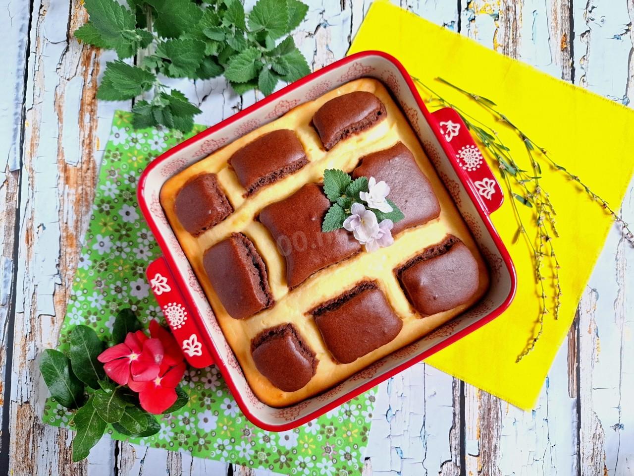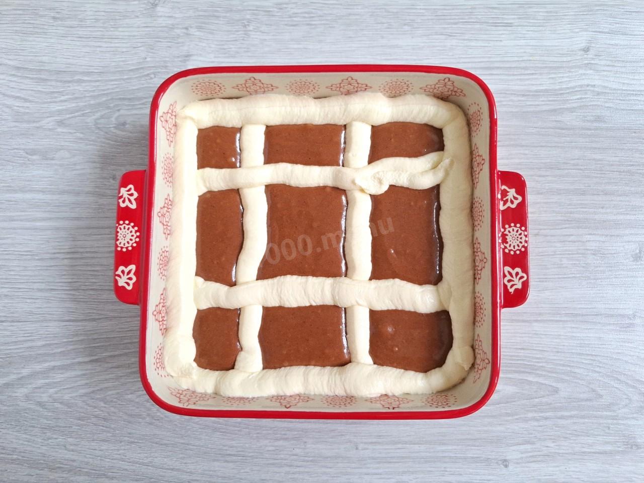 Начинку удобнее выложить в кулинарный мешок или плотный полиэтиленовый пакет. Кончик обрежьте так, чтобы начинка выходила толстой полоской. Форму смажьте каплей растительного масла и выложите в нее шоколадное тесто. У меня форма размером 20х20 см. Поверх теста сделайте полоски из творожного теста в виде решетки.