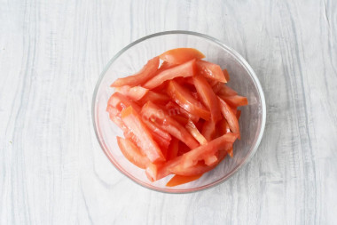 Помидоры вымойте, обсушите, нарежьте брусочками. По желанию можете удалить влажную сердцевину с семенами. Помидоры выбирайте спелые, но плотные. Мягкие плоды плохо держат форму, в процессе нарезки и приготовления они расползутся в бесформенную массу и испортят внешний вид блюда.