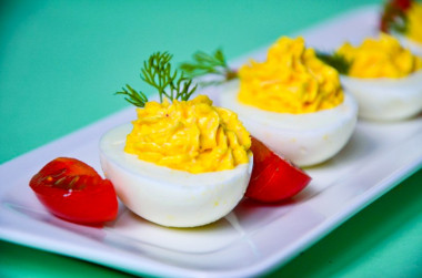 Украсьте половинки яиц по своему вкусу, можете воткнуть в каждую шпажку. Подавайте к столу. Приятного аппетита!