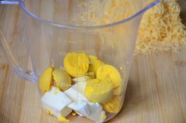 Сложите в миску яичные желтки, добавьте к ним мягкое сливочное масло, натертый сыр, укроп, сметану и горчицу. Можете также положить дольку чеснока — начинка получится острее. Посолите и поперчите.