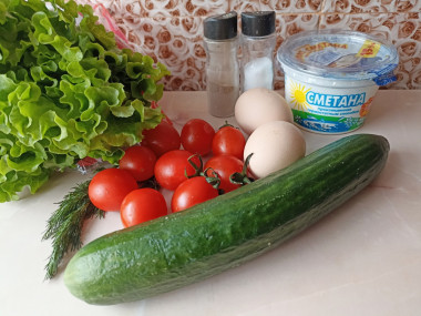 Калорийность продуктов: Огурцы, Помидоры черри, Яйца, Листья салата, Сметана, Зелень, Перец черный молотый, Соль