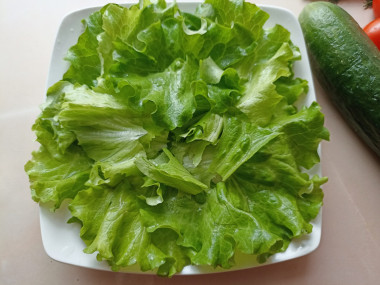 Возьмите блюдо для подачи салата (его можно подать и в салатнике, но на плоской тарелке салат смотрится красивее). На дно порвите листья салата. Важно сделать это именно руками, а не ножом, так как от соприкосновения с металлом салат быстро окислится и завянет.