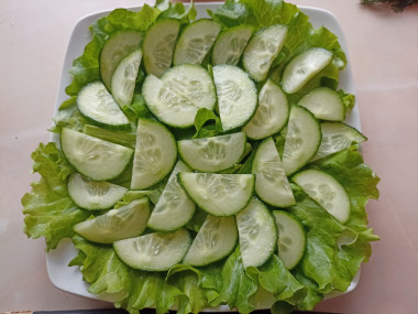 Огурец нарежьте кольцами. Обязательно попробуйте его, не горчит ли — такой плод испортит вкус блюда. Кожицу, если она не грубая и не повреждена, срезать не нужно.