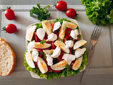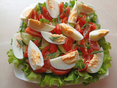 Очень изысканный салат помидоры огурцы яйца сыр - такой не стыдно будет и на праздничный стол поставить. Несомненно полезный и легок в приготовлении.