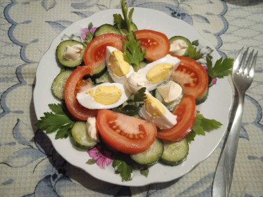 Отличный витаминный салат огурец помидор яйцо!!! Как раз то что нужно после долгой зимы!!! Яркий и аппетитный!!! Устоять трудно!!! Слюнки текут