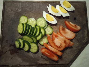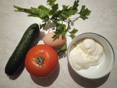 Очень люблю свежие овощные салатики. Сделала салат огурец помидор яйцо по этому рецепту. Готовила одну порцию на ужин. Яйцо домашнее сварила заранее, остудила и почистила. Помидор выбрала обычный крупный. За неимением листьев салата использовала свежую петрушку и выложила ее первым слоем. После уложила огурцы, помидоры, дольки яйца и "островками" выложила сметану. Простейшее приготовление, минимум времени и правильное питание на столе)