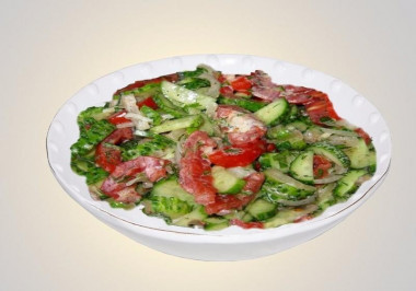 Между кусочками яйца хаотично разложите сметану. Посолите и поперчите салат по вкусу. Сразу подавайте его к столу — салаты из свежих овощей и зелени долго не стоят, так как из них выделяется сок. Приятного аппетита!