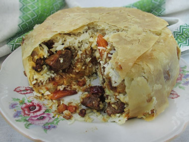Подавать горячим, разрезав на порционные куски. Правильный плов не будет похож на пирог: рис и мясо должны высыпаться из хрустящей оболочки.