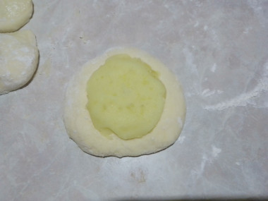 Возьмите одну часть теста, раскатайте в лепешку, при помощи дна стакана сделайте небольшое углубление и положите в него начинку.