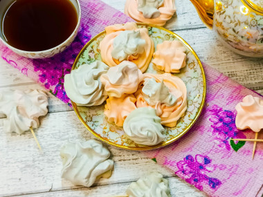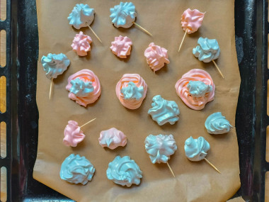 С помощью кондитерского мешка с различными насадками отсадите на противень, застеленный пергаментом, различные фигуры и поставьте противень в духовку, разогретую до 90 градусов на 1,5-2 часа. Меренги не должны выпекаться. Они должны высушиться. При высокой температуре они будут подгорать. Точное время и температуру запекания определяйте по своей духовке.