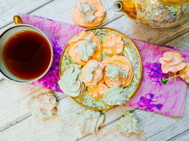 Подсушивала безе на силиконизированном пергаменте. Минимальная температура разогрева моей духовки (у меня газовая) 130 градусов, поэтому готовила безе с приоткрытой дверцей. У меня ушло 2 часа. Получились меренги легкие и воздушные. Несколько штучек сделала на зубочистках, чтобы получились как бы конфетки на палочках. Детям такие меренги особенно понравились.