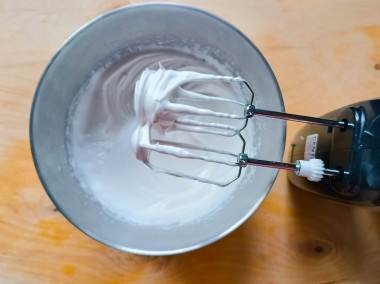 Самое главное - это меренгу не перевзбить. Перевзбитая меренга не будет иметь блестящего глянца и пойдёт комочками.