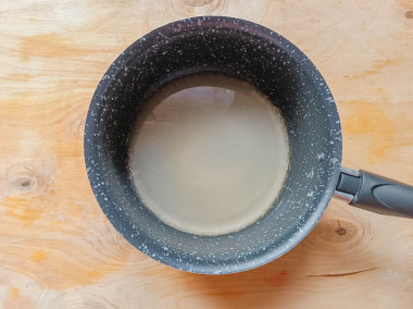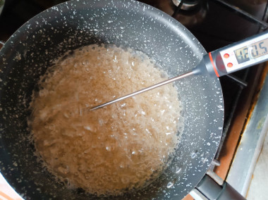 В небольшом ковше соедините сахар с водой и поставьте на огонь. доведите до кипения. Для правильной консистенции сиропа необходим кулинарный термометр. Держите его в сиропе, не касаясь дна, до достижения нужной температуры. Ориентироваться в варке сиропа на карамельный шарик я не советую. Пока вы его остужаете и пробуете, сироп варится и его температура меняется.