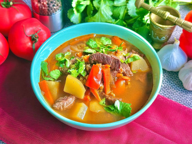 Суп вышел наваристый, густой и насыщенный красочный. В нем разнообразные текстуры продуктов и размер. Выглядит ярко и аппетитно. Вкус насыщенный, богатый, с глубоким вкусом томатного мясного бульона. Количество мяса, картофеля, овощей, крупы заменяет второе блюдо. Отлично сочетать со свежими овощными салатами и свежими лепешками хлеба.