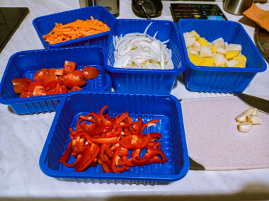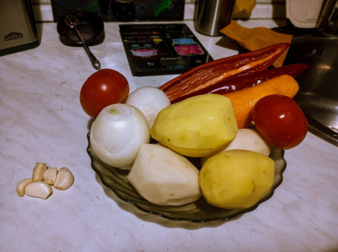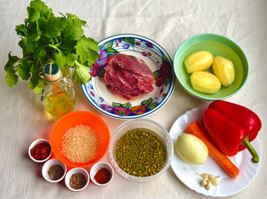 Подготовила все ингредиенты, мясо промыла, вес моей говядины 350 гр, без костей, брала мякоть. Чеснока взяла больше, так как у меня очень маленькие зубчики. В то время, когда обжаривалась мясо на умеренно сильном огне, я поставила кастрюлю с водой на огонь. Пока обжаривалось мясо и кипятилась вода, нарезала овощи. Положила мясо в кастрюлю - вариться. Сделала зажарку из овощей и специй. Немного сняла с воды пленку от мяса с помощью сита, чтобы бульон был чище. Сразу в кастрюлю к мясу добавила картофель, зажарку и маш для экономии времени. Через 30 минут добавила рис и также засекла 10 минут.