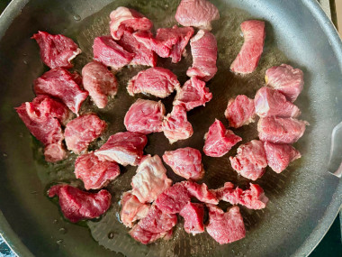 Для супа с машем используют говядину или баранину, можно на кости, если вы любите такое мясо. Выбранный кусочек мяса промойте под проточной водой и нарежьте на небольшие порционные кусочки. Обжарьте мясо до золотистого цвета на подсолнечном масле. Дальше я переложила мясо в отдельную посуду, а сковороду вымыла.