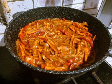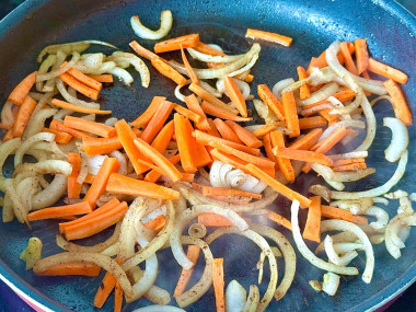 В сковороде обжарьте до мягкости лук, нарезанный полукольцами, и морковь соломкой. Можно обжаривать овощи прямо с мясом. Но мне больше нравится делать это отдельно, потому что говядина в дальнейшем сможет дольше вариться (и, соответственно, стать более мягкой), а заправку добавим в бульон позже, что позволит ей остаться не разваренной.