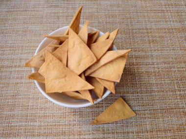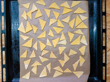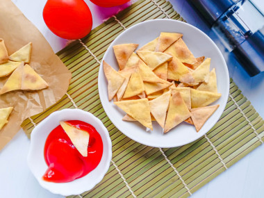 Замесила тесто, раскатала его в тонкий пласт, потом поняла что можно было и тоньше. Нарезала ножом на порционные кусочки. Выложила чипсы на противень застеленный силиконовым ковриком. И запекала минут 10 при температуре 200 градусов.