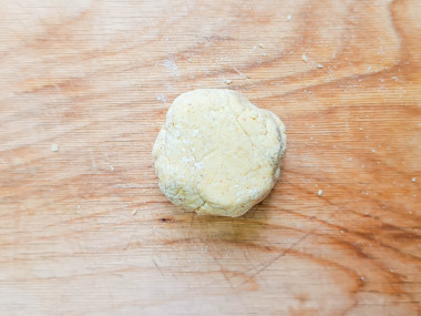 Разделите тесто на 2-3 части. Часть теста выложите на рабочую поверхность, хорошо присыпав её мукой.